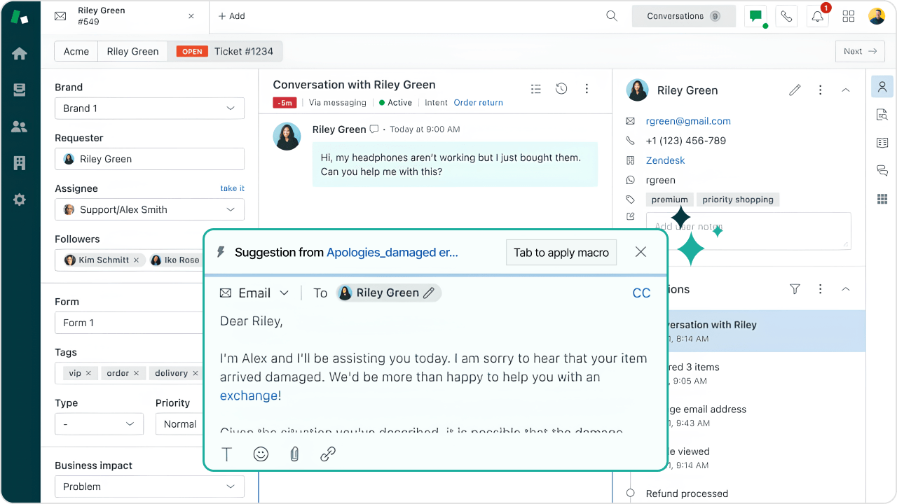 Zendesk AI agents can automate replies, suggest macros, and triage tickets by intent, sentiment, or language. For highly specialized cases, they seamlessly escalate to human support agents to ensure a great customer experience.