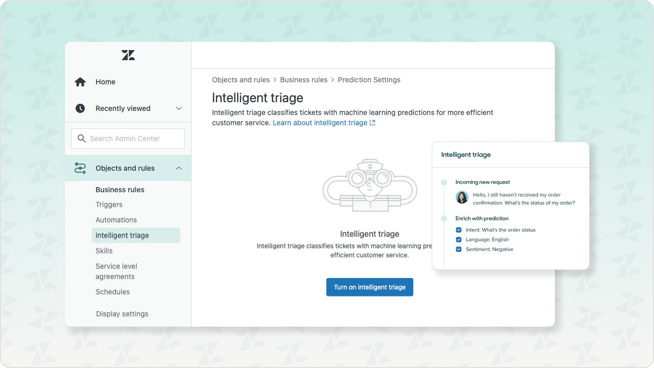 Activate Zendesk AI tools: Enable AI features in your Zendesk Admin settings. For detailed automation settings, check the Admin Center. Advanced AI tools like intelligent triage are available by adding the Advanced AI add-on.