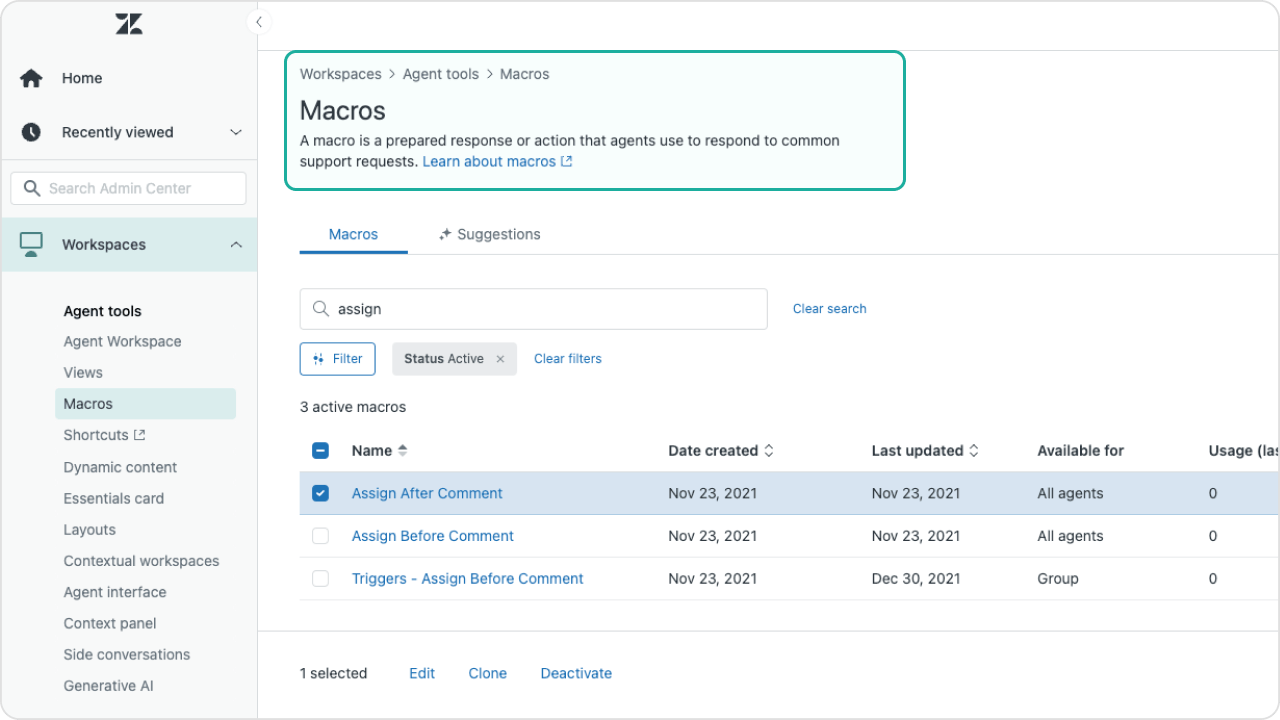 Macros help streamline your support processes. With AI, Zendesk is able to suggest new macros that can be added to your existing macros. This is based on an analysis of your previous macro usage, and comparing with the subject and content of the ticket. This is an optional feature that can be turned off, or limited to macros with only a certain threshold of data.