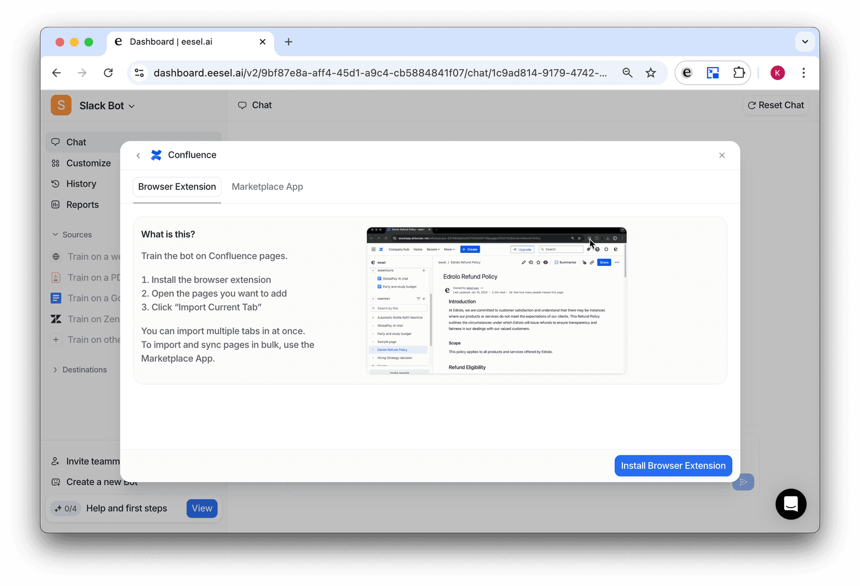 - Open the extension when you have your Confluence pages open, and select the correct bot.