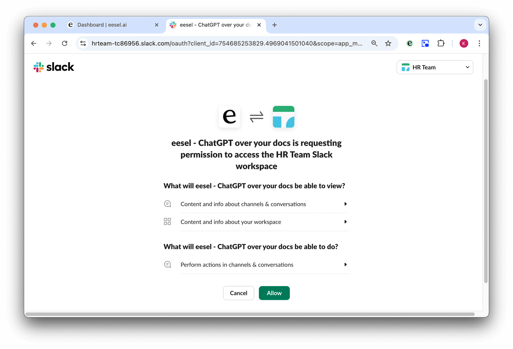 - Select the workspace you’d like to add eesel, and click allow.