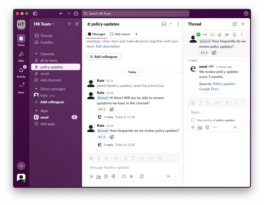 With eesel AI, you can create an AI bot or agent that can be trained on your Confluence pages. You can then connect this AI bot to your Slack, allowing your team to access the knowledge your bot is trained on and ask it questions.