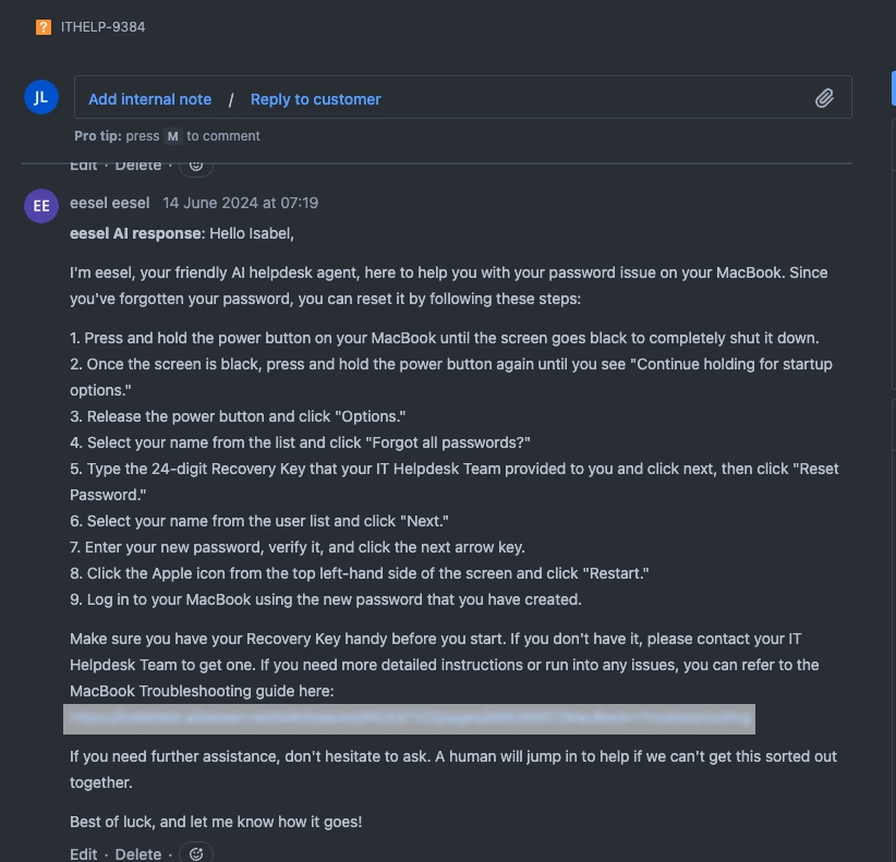InDebted uses eesel as their "first responder" for their helpdesk tickets, acting just as an agent would and suggesting how issues could be resolved. "It reduces the need for a human to have to deal with an issue that could be resolved by referring to documentation or by walking the user through steps," Jason explains.