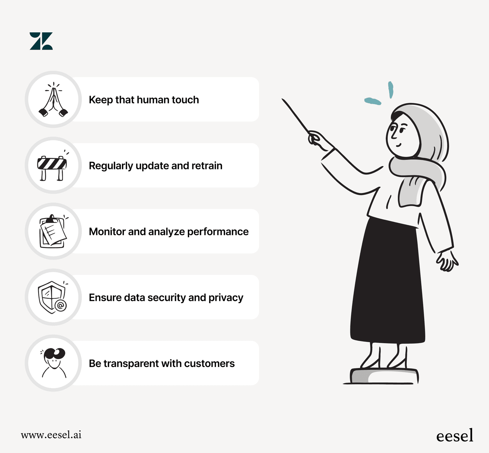 - Be transparent with customers: Inform customers when they are interacting with AI. This transparency builds trust and sets appropriate expectations.