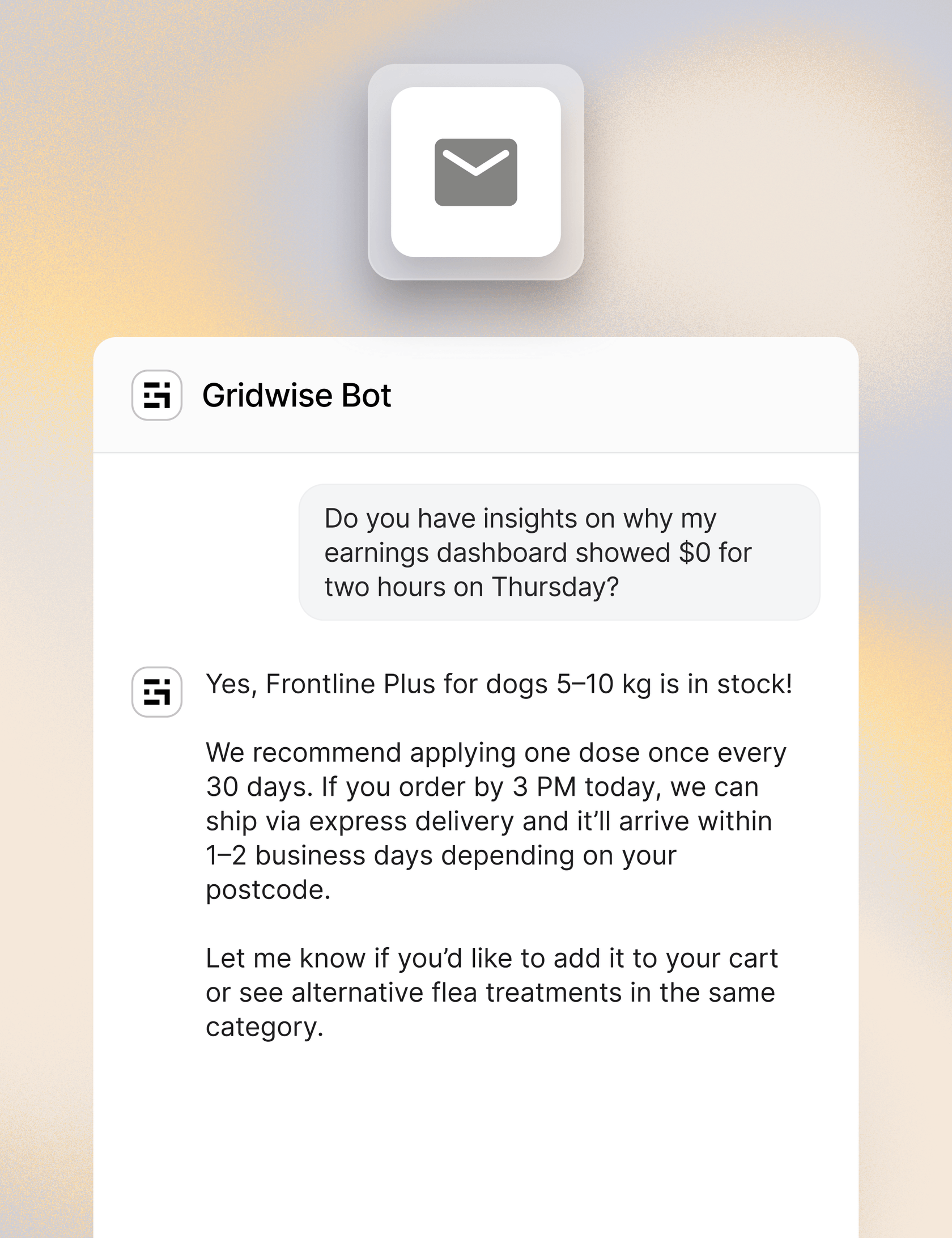 Conecta la IA a tu catálogo de Shopify en vivo para obtener información de productos en tiempo real.