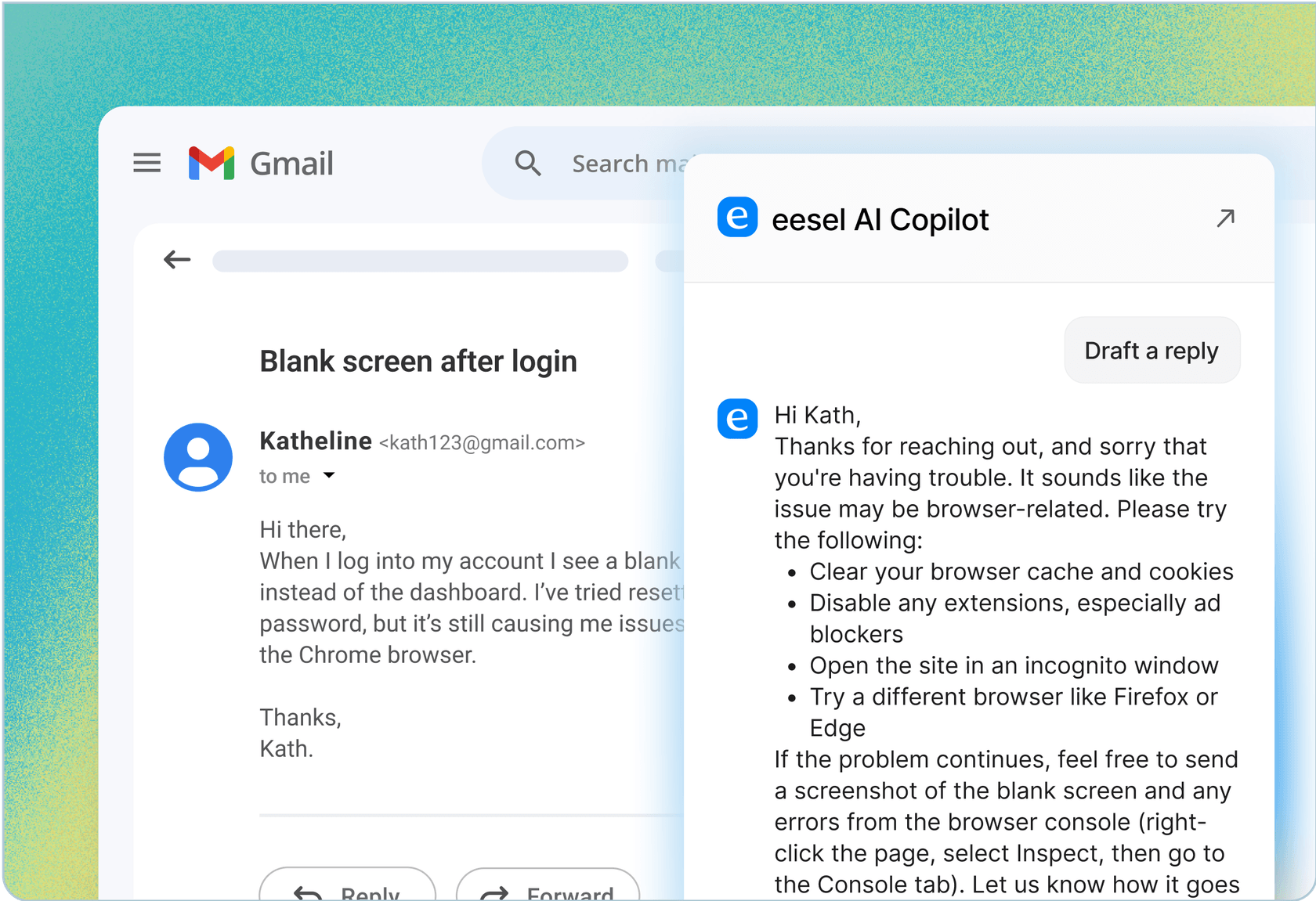 L'IA rédige des réponses pour les tickets, emails et chats, et les agents humains peuvent facilement vérifier et envoyer.