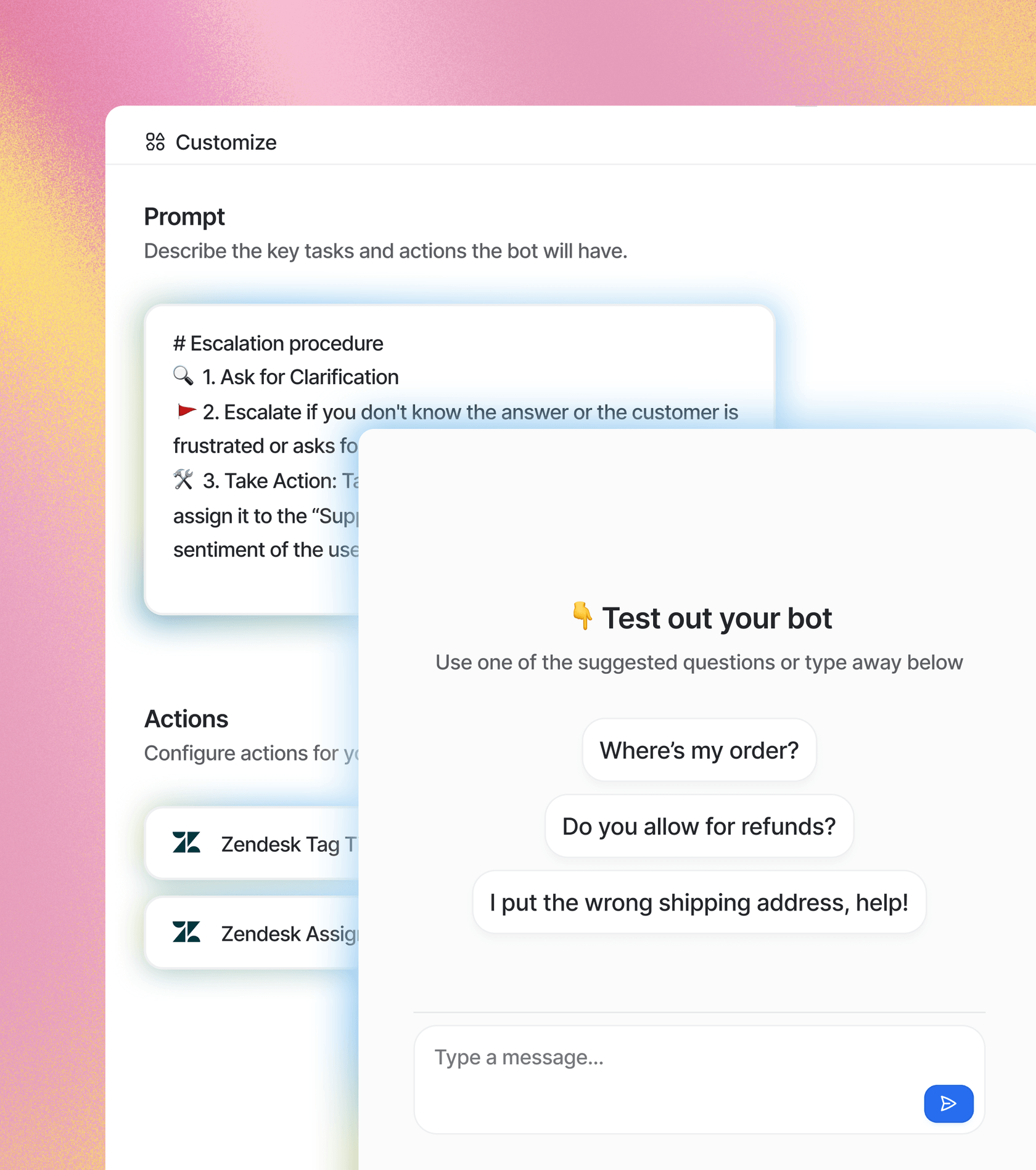 Personnalisez la façon dont le bot parle, comment il pose des questions de clarification, l'apparence de la bulle de chat et plus encore.