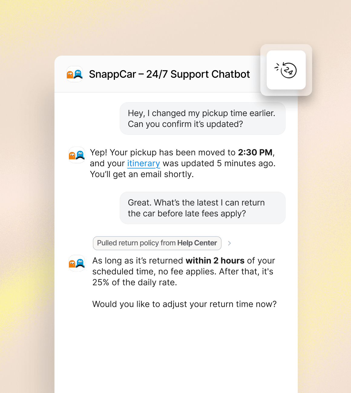 Les clients obtiennent des réponses instantanées sur le suivi de leurs commandes, les retours ou les demandes de support basées sur vos documents et bases de données clients.