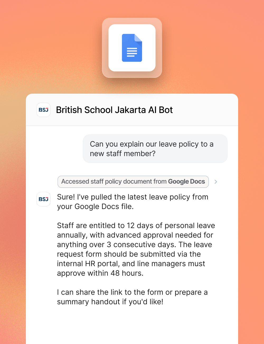 Connectez votre Google Drive et ajoutez Google Docs directement à votre bot, synchronisé et tout.