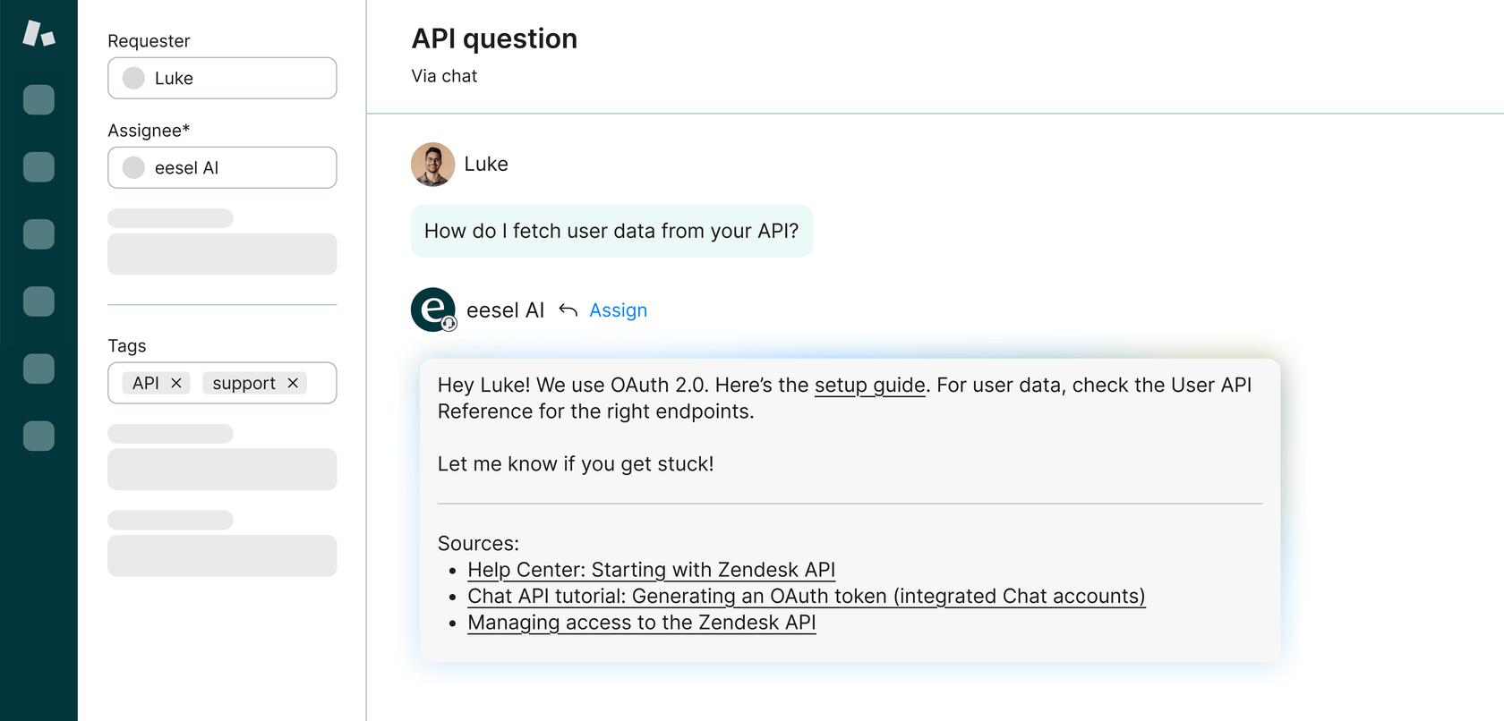 Zendesk AI with eesel is a plug-and-play integration that adds intelligent automation to your Zendesk support workflows. It learns from your tickets, macros, and help center content to draft replies, route requests, and streamline day-to-day support.