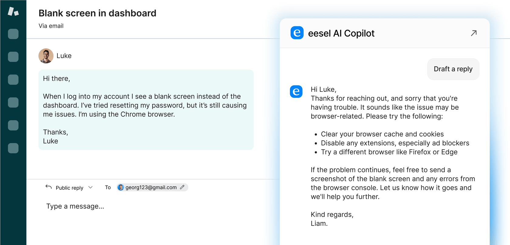 eesel AI automatically learns about your company and tone of voice from past tickets, help centers, macros, and docs, and then draft replies for incoming queries.
