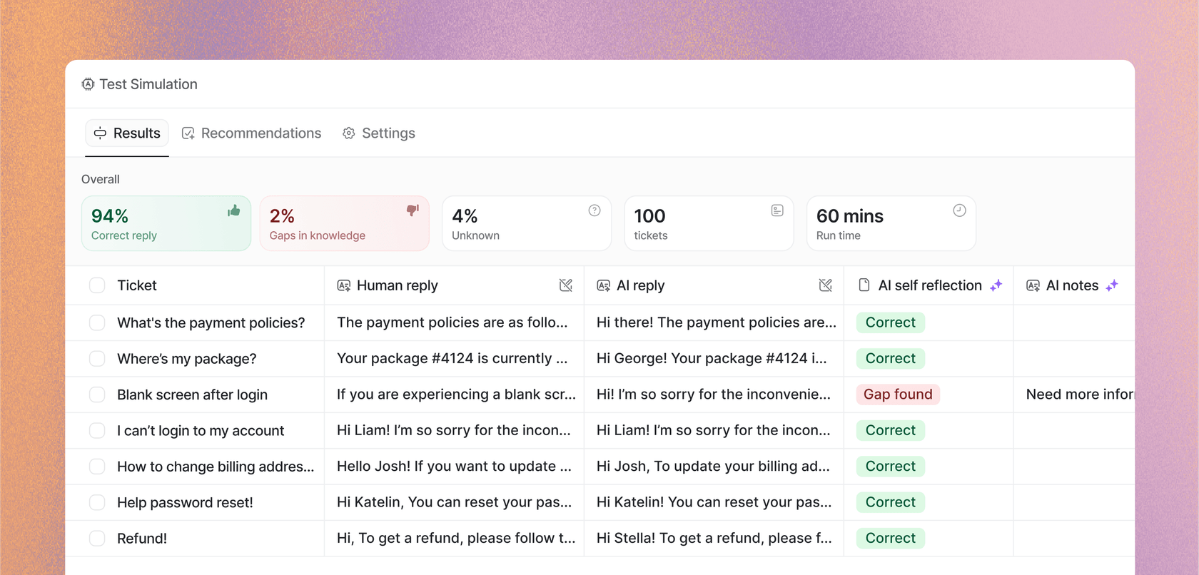 Run simulations in a test environment over past tickets, and see how the AI agents perform.
