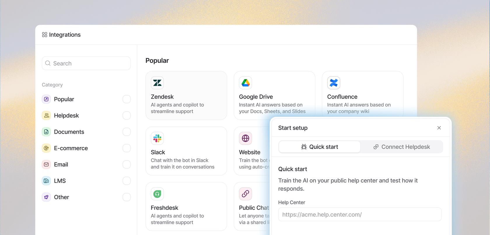Seja seu centro de ajuda público ou protegido por login, os agentes de IA podem aprender com ele e começar a responder perguntas imediatamente.