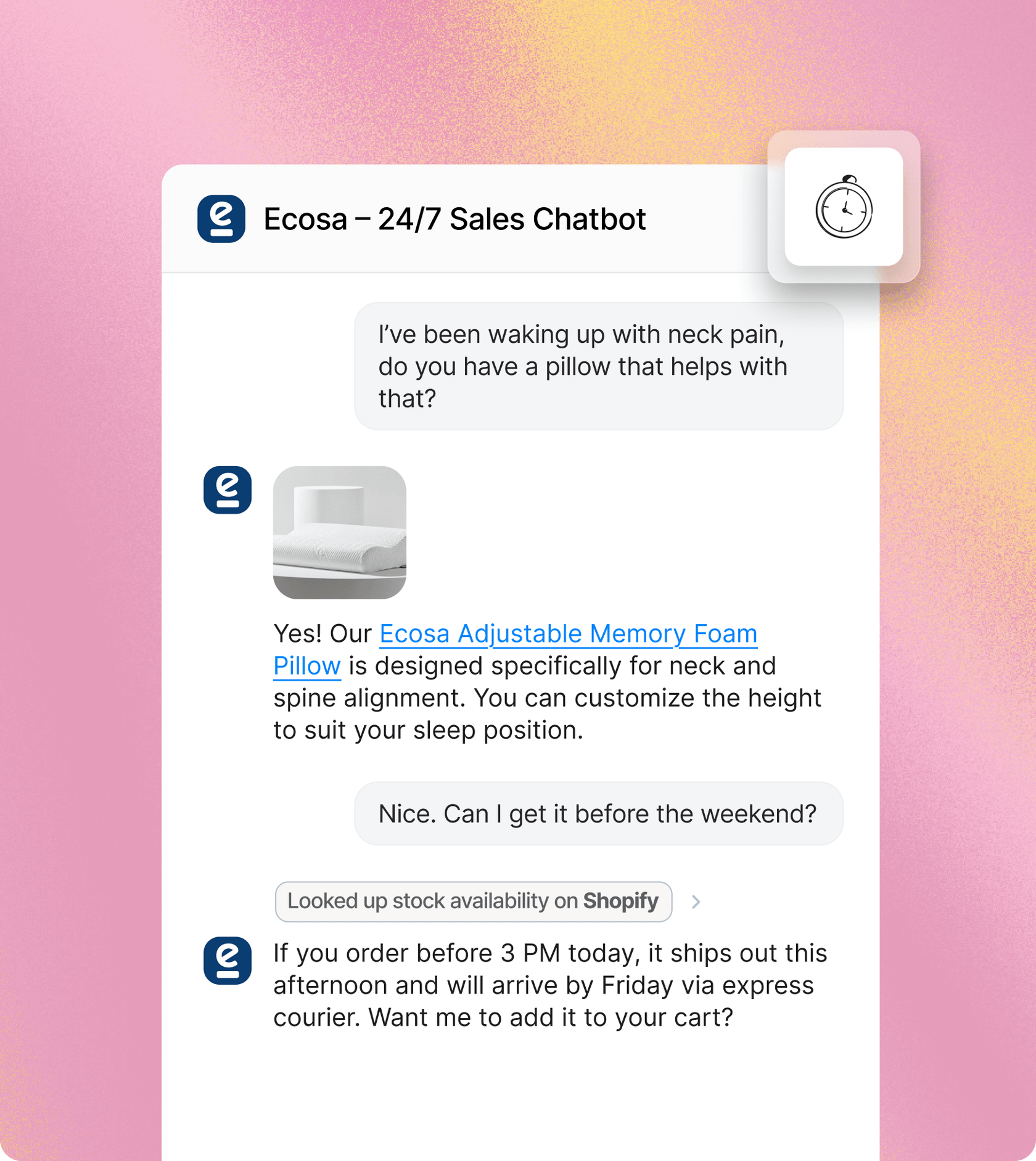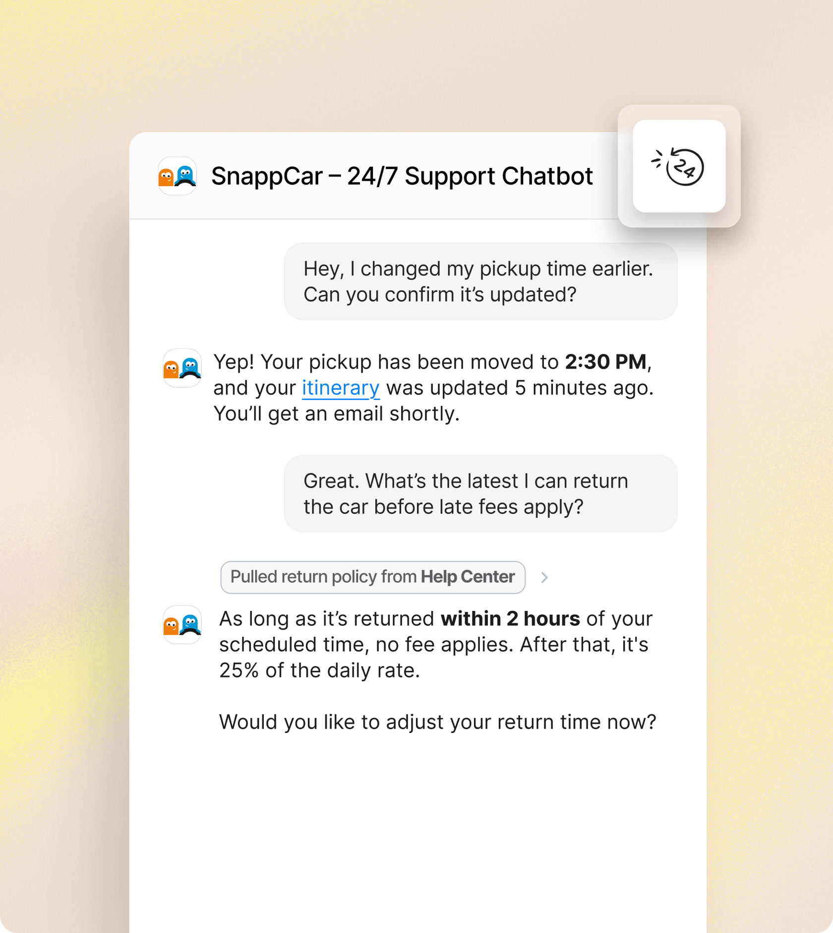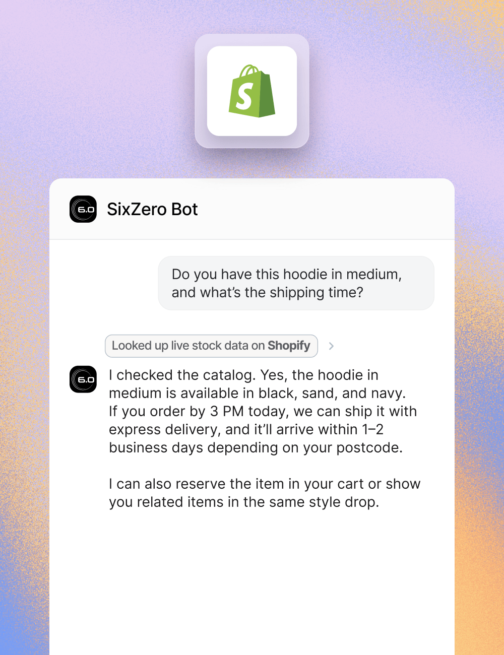 Customers get instant answers about their order tracking, returns, or support queries based on your docs and customer databases.