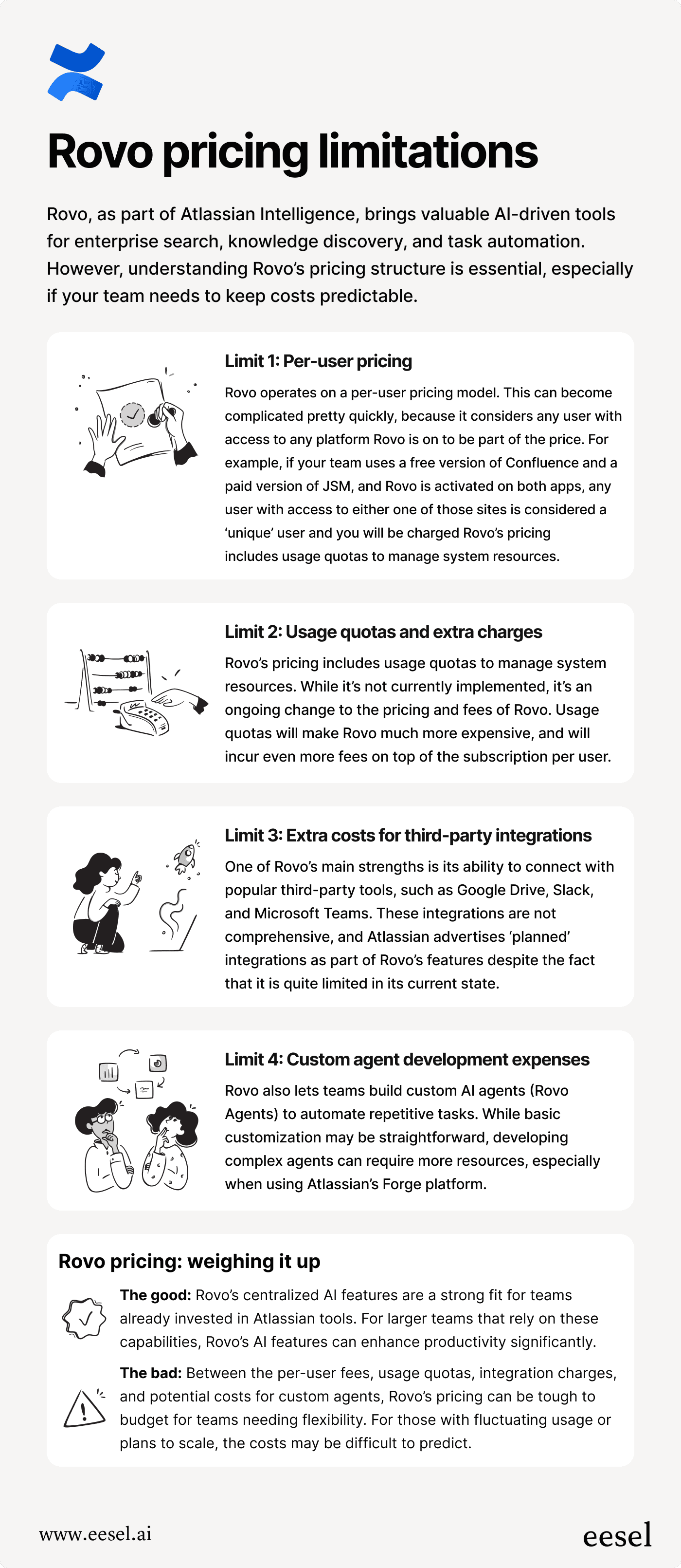 Rovo charges for heavy data use from integrations, while eesel AI includes unlimited integrations without extra fees.