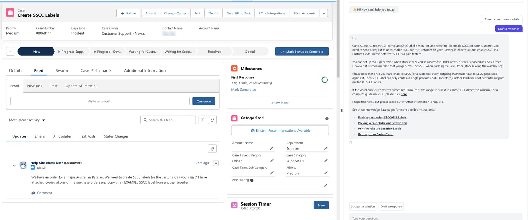 CartonCloud uses several tools and apps that need access to their internal documentation and their public knowledge base. They have used eesel AI to integrate into their Salesforce Service Cloud UI to help manage their support services. Their team is able to access the right documentation for the right issues.