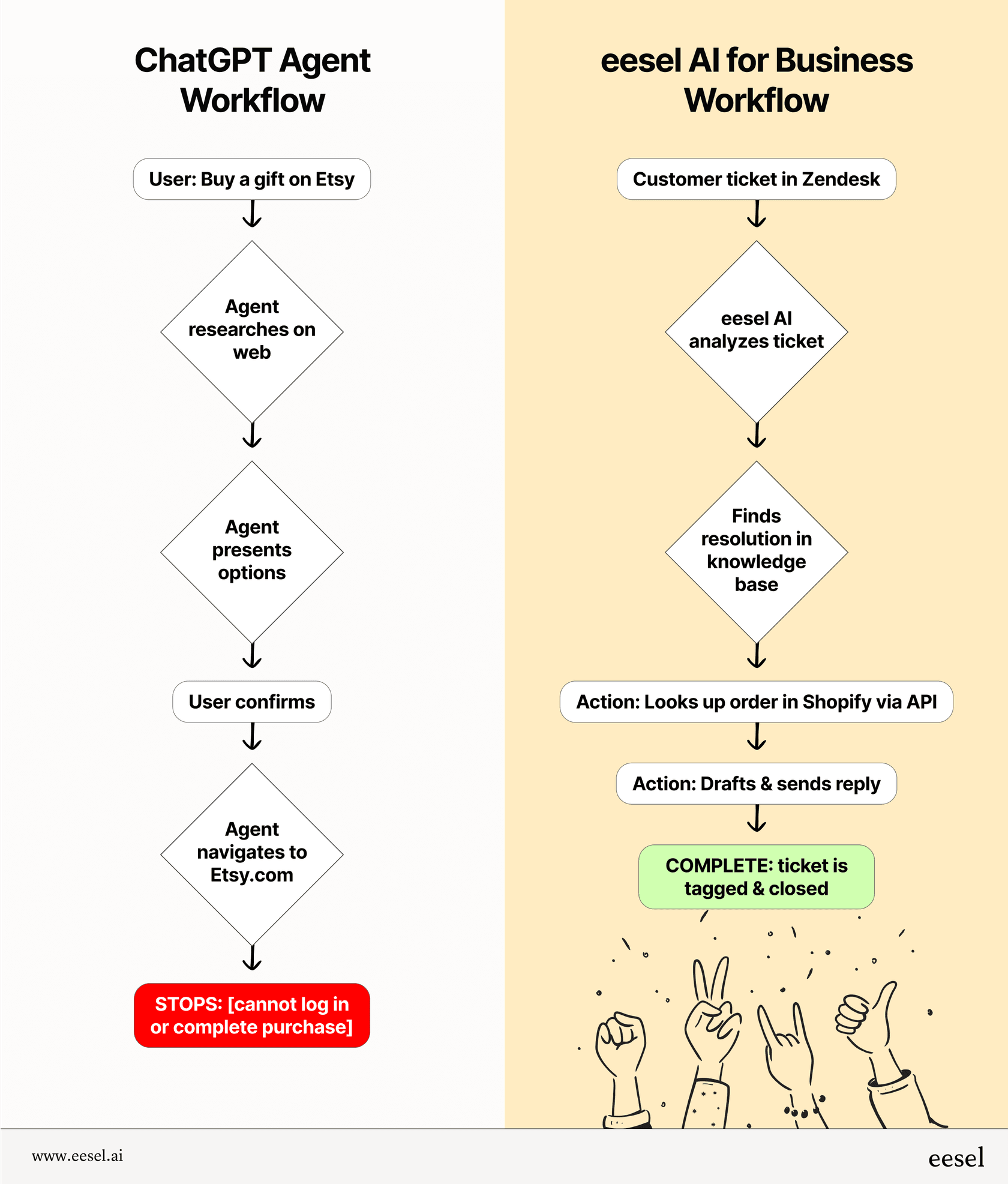 The biggest difference is integration and action. ChatGPT agents are limited to their virtual environment, while specialized AI like eesel AI integrates directly with your business tools (e.g., Zendesk, Slack) to take real, reliable actions like tagging tickets or drafting replies.