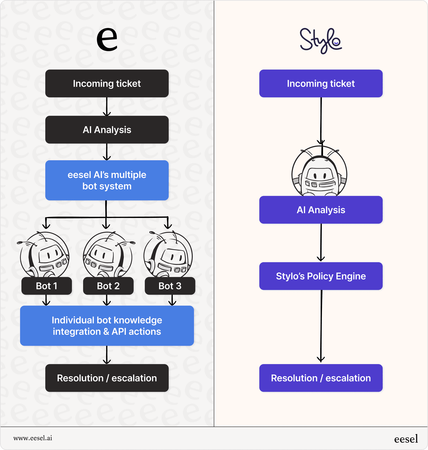 Stylo focuses on leveraging their Policy Engine and existing Knowledge Base articles. While this works well for teams with well-documented processes, it may require more manual customization to achieve the same level of specialized handling that eesel AI offers through its multi-bot system.