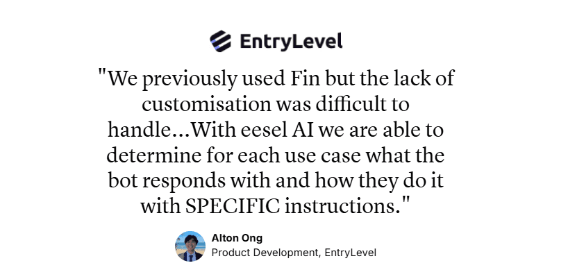 EntryLevel's experience offers another compelling case study. After finding limitations with other tools, they switched to eesel AI. "We previously used other tools but the lack of customisation was difficult to handle... With eesel AI we are able to determine for each use case what the bot responds with specific instructions," explains Alton Ong, Product Development at EntryLevel (source).