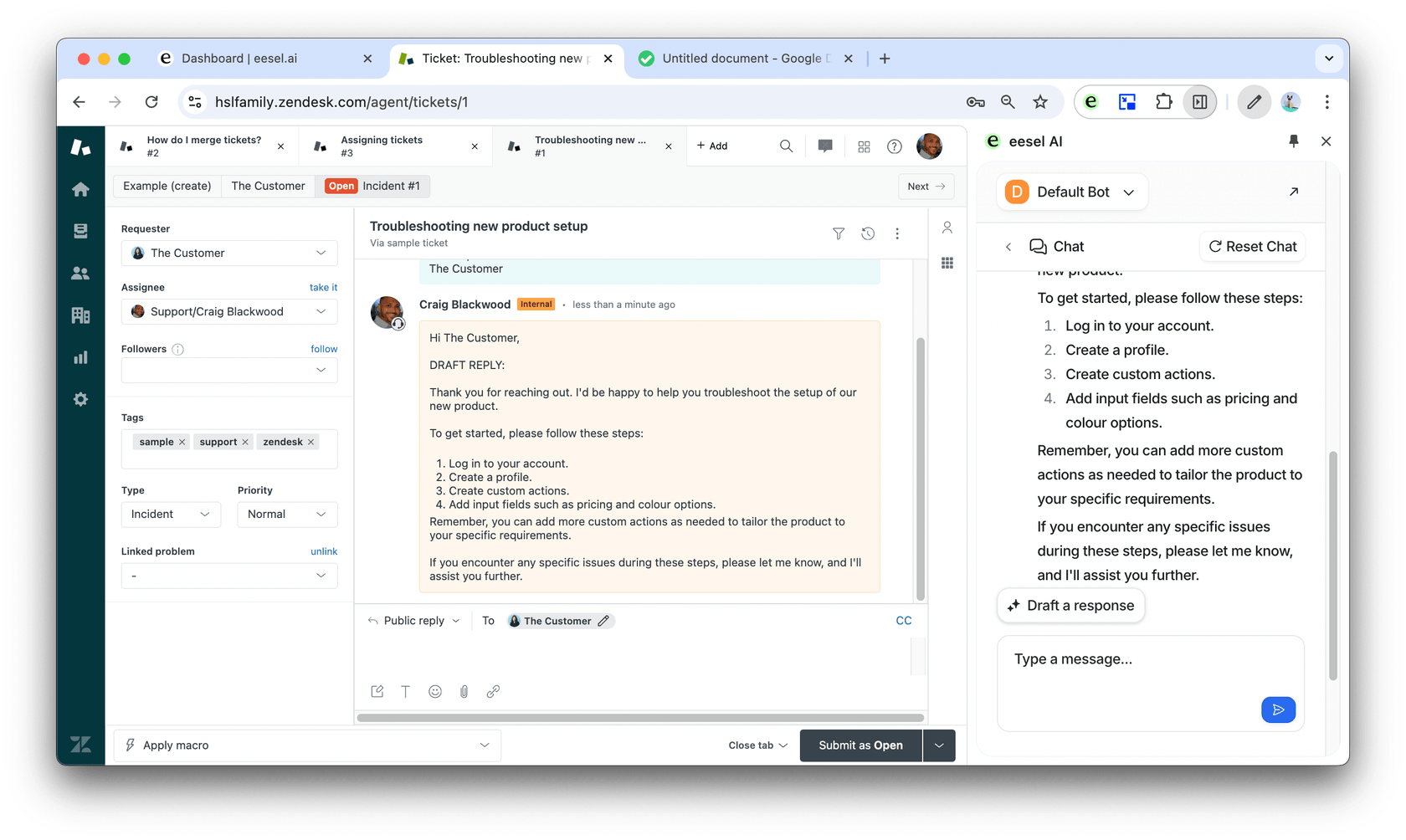 Zendesk is the industry-leading help desk platform, trusted by thousands of companies to power their customer service. When handling high ticket volumes and repetitive inquiries, teams often look for ways to further optimize their workflow. eesel AI is a powerful AI assistant that integrates seamlessly within the Zendesk ecosystem so teams can simplify, streamline, and even automate the drafting process. The result? A faster team and more consistent replies for customers.