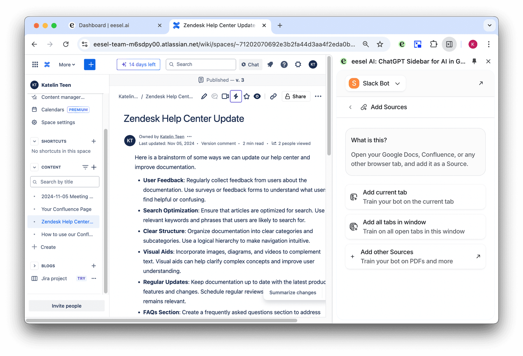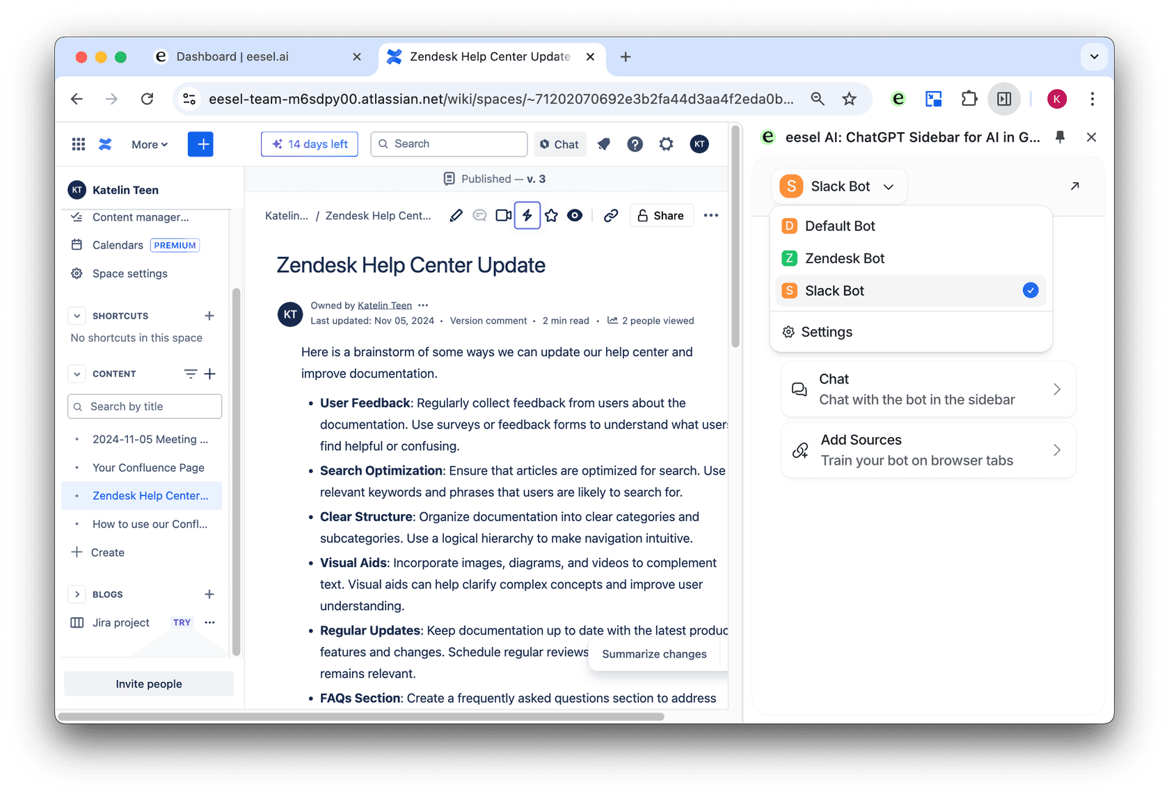 With eesel AI, you can create an AI bot or agent that can be trained on your Confluence pages. You can then connect this AI bot to your Slack, allowing your team to access the knowledge your bot is trained on and ask it questions.