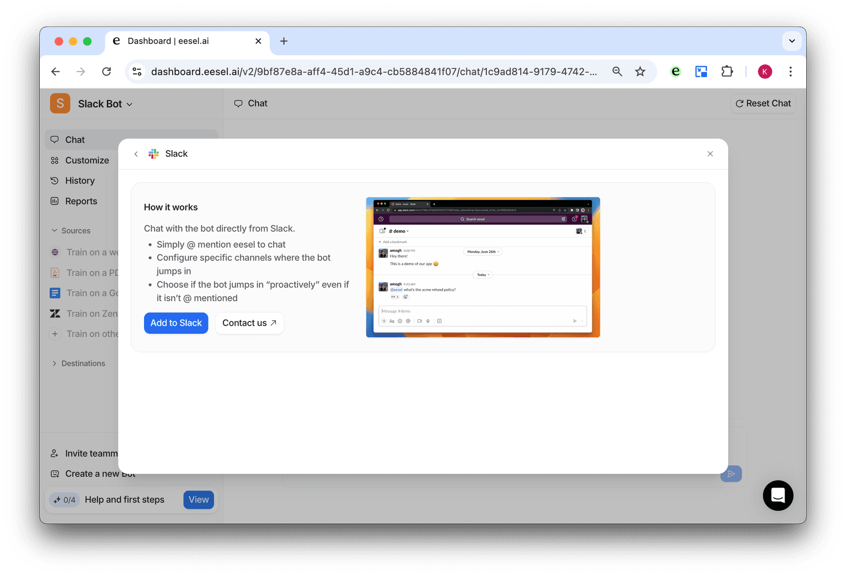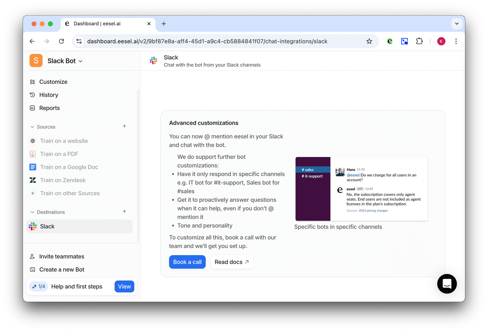 - Contact us to set up any more advanced customizations, like more than one bot for a workspace in different channels.