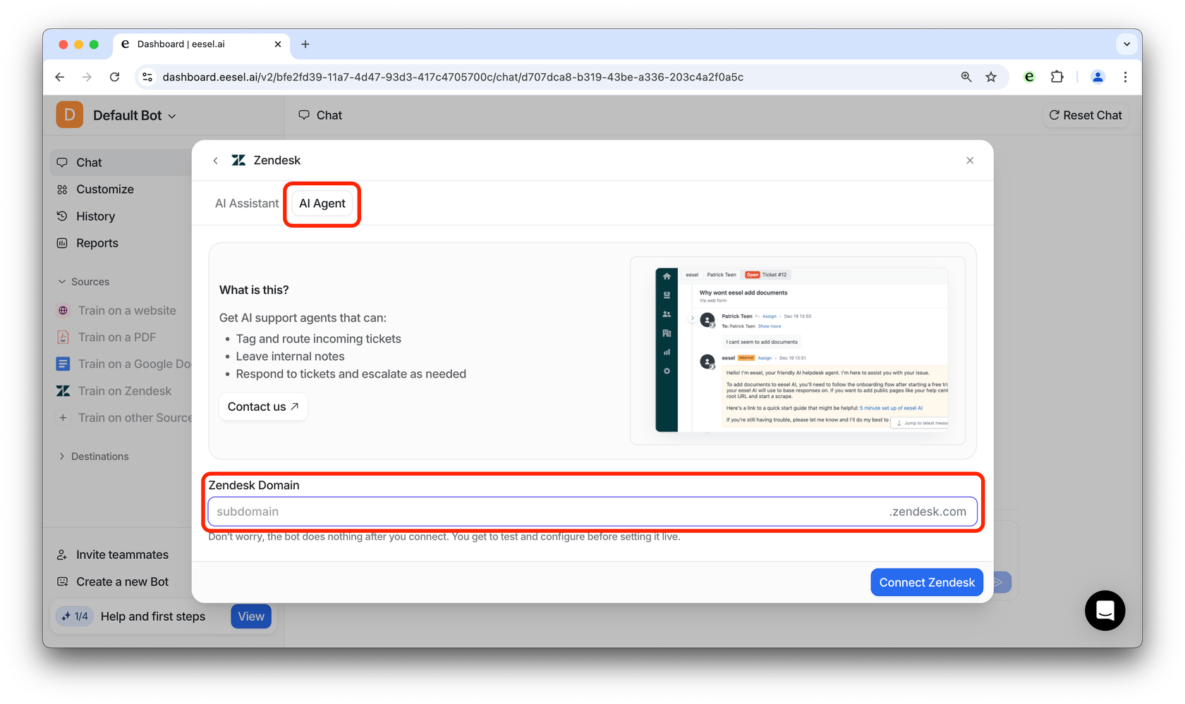 Here’ are a few simple steps to get your eesel AI agent working alongside Zendesk: