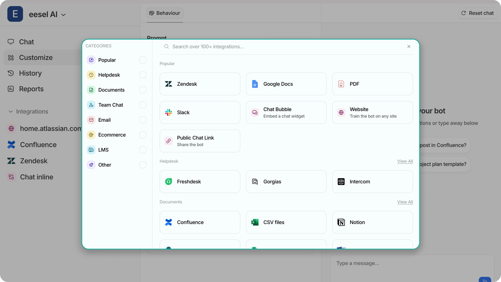 Damit KI effizient arbeitet, muss sie sich mit Werkzeugen integrieren wie Helpdesks, CRMs und E-Commerce-Plattformen. eesel AI vereinfacht dies, indem es sich mit über 100 Wissensquellen verbindet und eine vollständige Einrichtung in 1-2 Wochen ermöglicht. Indem Sie Ihre KI mit dem verbinden, was Sie bereits haben, wird der Trainingsprozess noch einfacher. Stellen Sie sicher, dass Sie die richtigen Plattformen für die richtigen Bots auswählen.