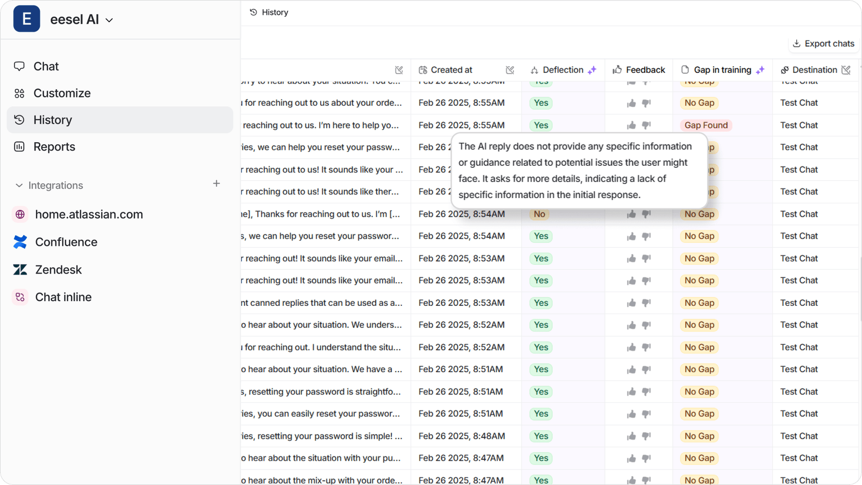 Der Erfolg der KI zeigt sich in der Ablenkungsrate, je höher diese ist, desto mehr Tickets werden ohne menschliche Hilfe bearbeitet. Das bedeutet im Wesentlichen, dass sich Ihre Live-Agenten auf komplexere oder wichtigere Tickets konzentrieren können, da Ihre KI in der Lage sein wird, die meisten Tier-1-Tickets zu lösen.