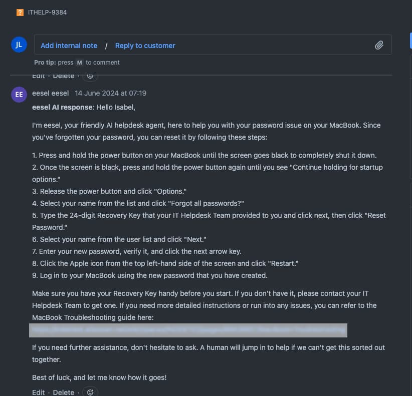 Ihr Support-Team kann Kunden nun dabei helfen, korrekt auf die richtigen Informationen zuzugreifen, während eesel AI anhand dieser Dokumentation erklärt, wie ihre Probleme gelöst werden können. Dies gibt dem Team den Freiraum, an komplexeren Themen zu arbeiten.