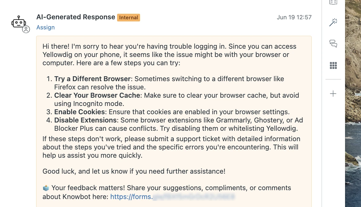 Yellowdig ha mejorado su robusto centro de ayuda (help desk) de soporte, Zendesk, mediante la redacción automática de borradores de respuestas sugeridas y brindando soporte fuera del horario de oficina.