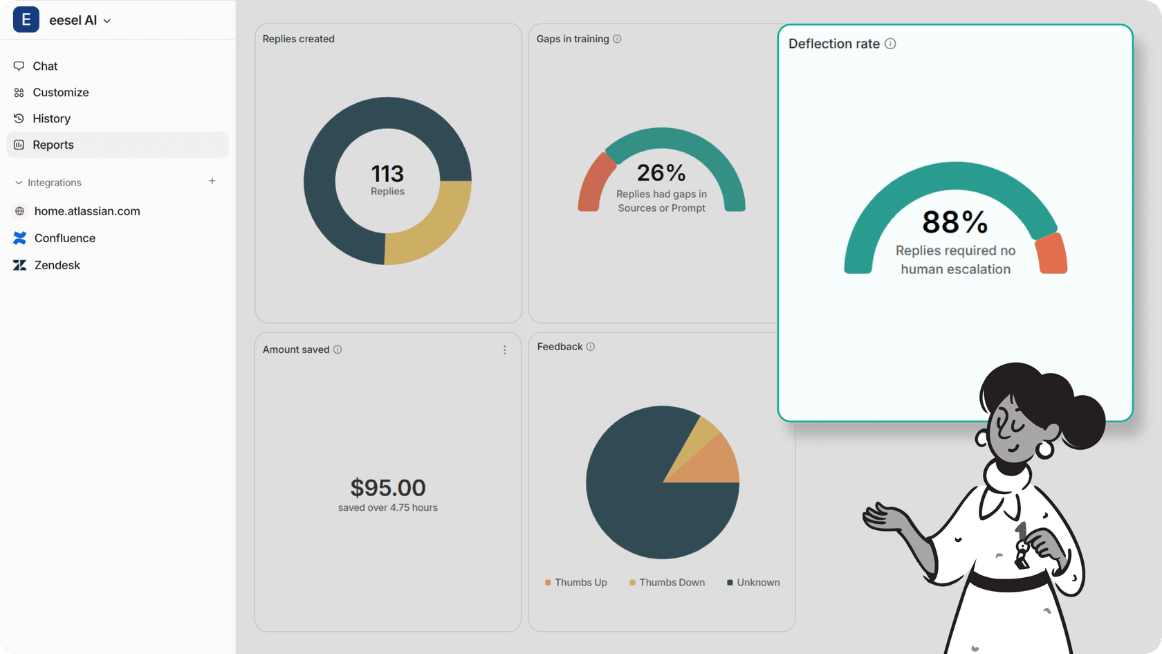 Bien que eesel AI puisse gérer jusqu'à 80% des demandes de routine grâce à l'automatisation intelligente, maintenir la qualité nécessite un équilibre stratégique. Le système escalade automatiquement les cas complexes nécessitant de l'empathie ou des connaissances spécialisées vers des agents humains, garantissant une expérience client optimale pour tous les types d'interactions.