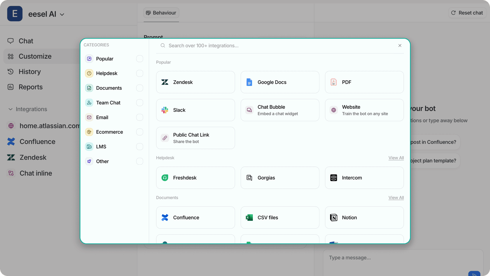 Pour que l'IA fonctionne efficacement, elle doit s'intégrer avec des outils comme les services d'assistance, les CRM et les plateformes de commerce électronique. eesel AI simplifie cela en se connectant à plus de 100 sources de connaissances et en offrant une configuration complète en 1 à 2 semaines. En connectant votre IA à ce que vous avez déjà, cela rend le processus de formation encore plus facile. Assurez-vous de sélectionner les bonnes plateformes pour les bons bots.