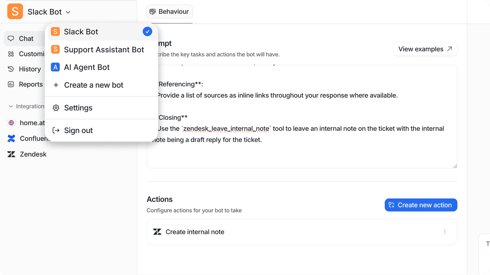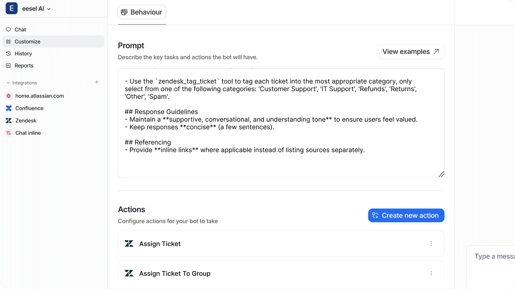 Configurez vos modèles de réponse (si vous choisissez de les utiliser), afin qu'ils correspondent au ton de votre marque. Les protocoles ou actions d'escalade doivent également être configurés pour permettre à votre IA de savoir quand il est approprié d'escalader un ticket à un agent en direct ou d'effectuer d'autres actions. Avec certaines plateformes d'IA telles que eesel AI, vous pouvez affiner votre IA à travers une invite, en vous assurant que cela correspond à la voix/ton de votre marque et en le mettant à jour pour garder vos réponses précises.