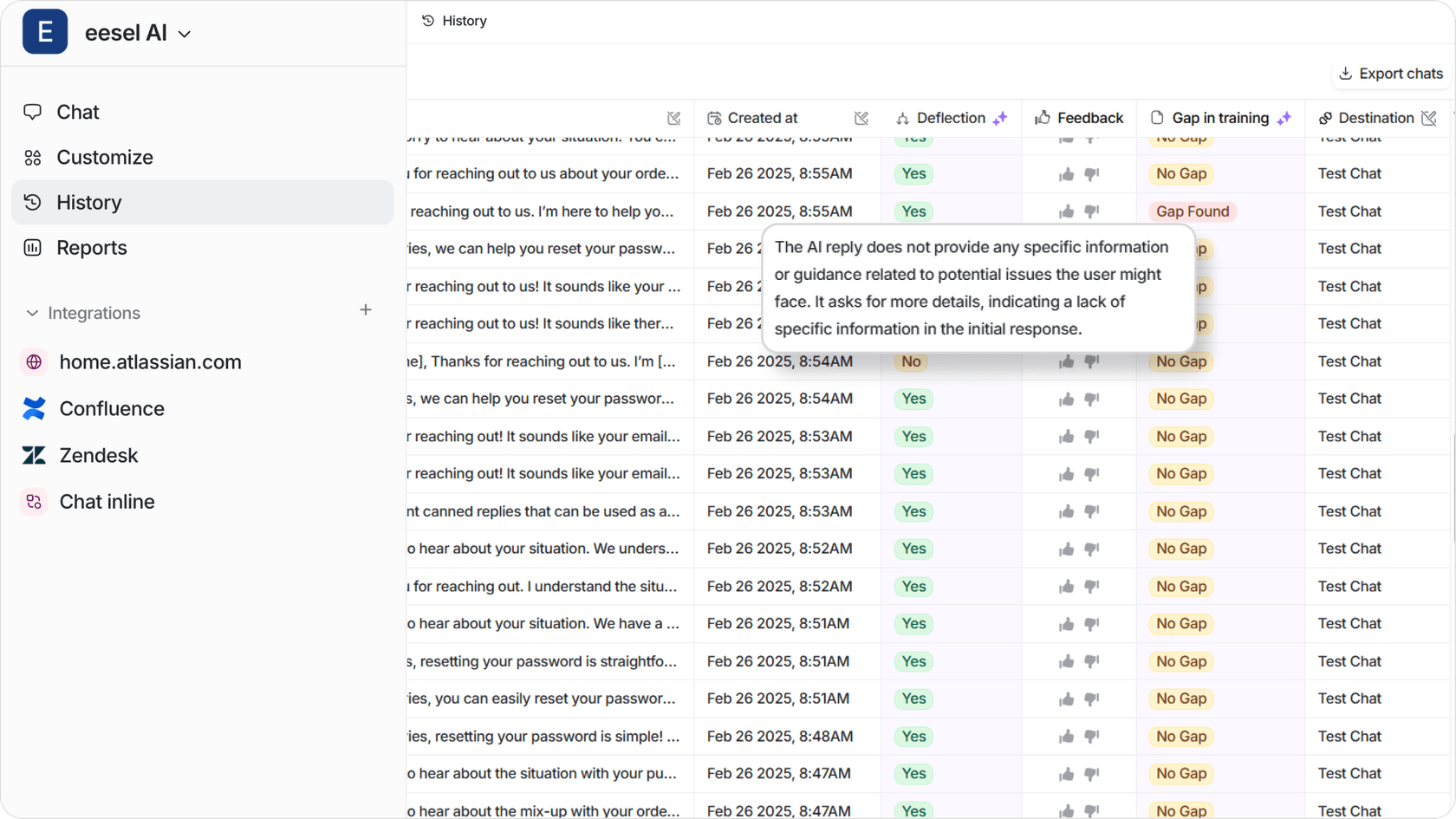 Simulez les interactions avec les clients en utilisant des tickets passés pour mesurer la précision des réponses de votre IA. Assurez-vous toujours que les réponses correspondent au ton de votre marque, sinon cela ressemblera simplement à un chatbot banal. Assurez-vous de tester si le chatbot IA escalade réellement vers des agents en direct aux bons moments en simulant ces types de scénarios/tickets.