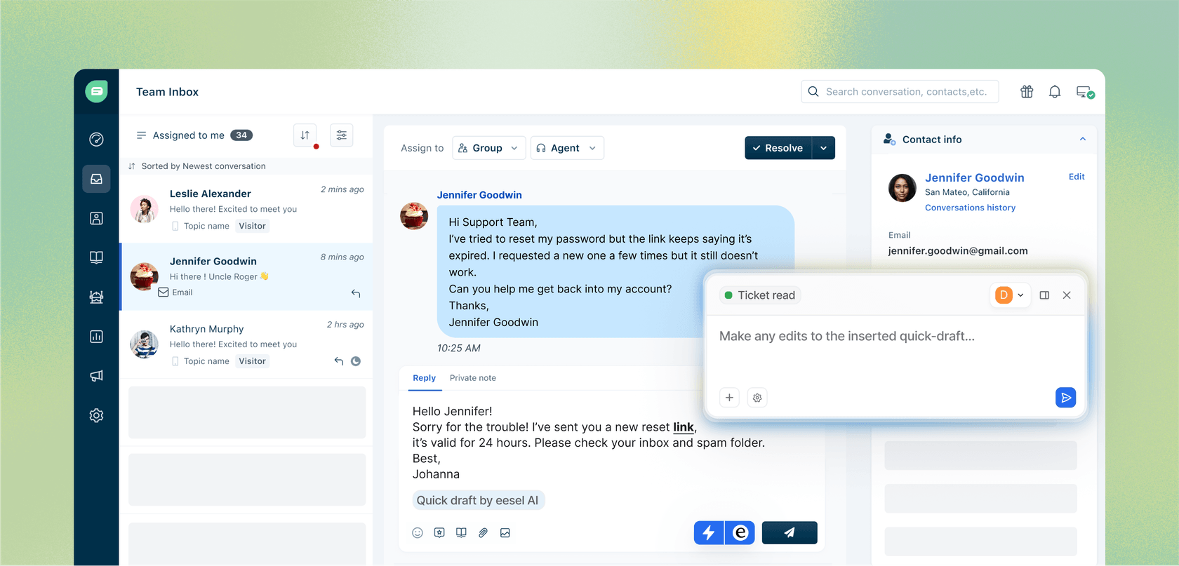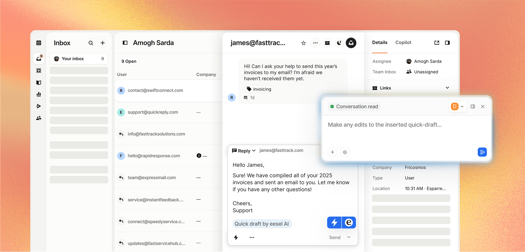 Les agents IA utilisent vos conversations existantes - comme les e-mails, les tickets et les chats en direct - pour comprendre comment vous parlez et répondez dans votre voix.