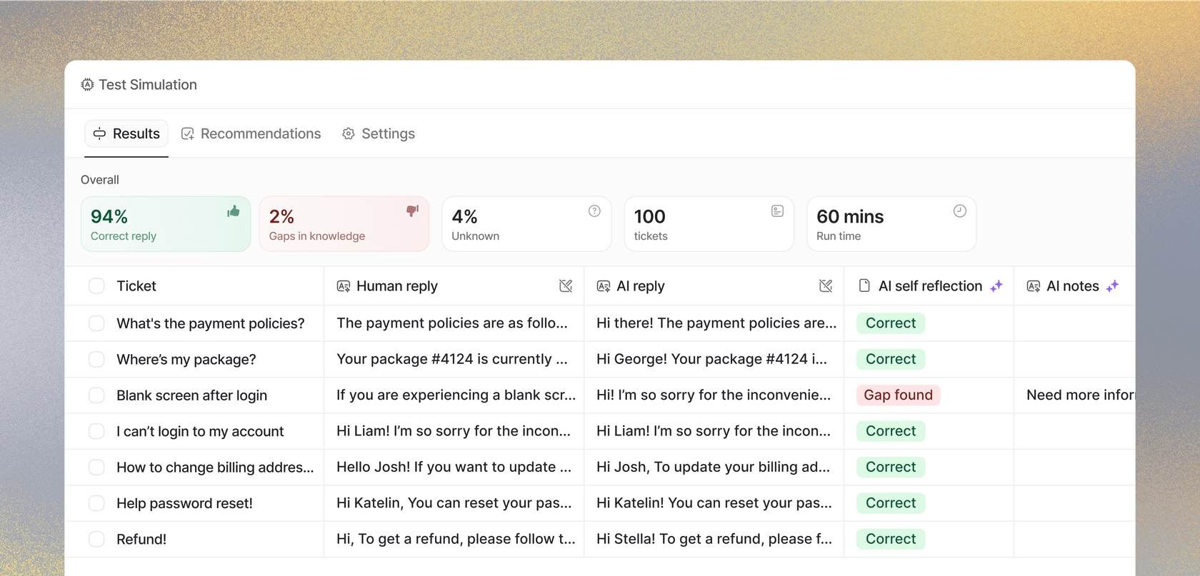 Run simulations in a test environment over Big Commerce’s past tickets, and see how the AI agents perform.