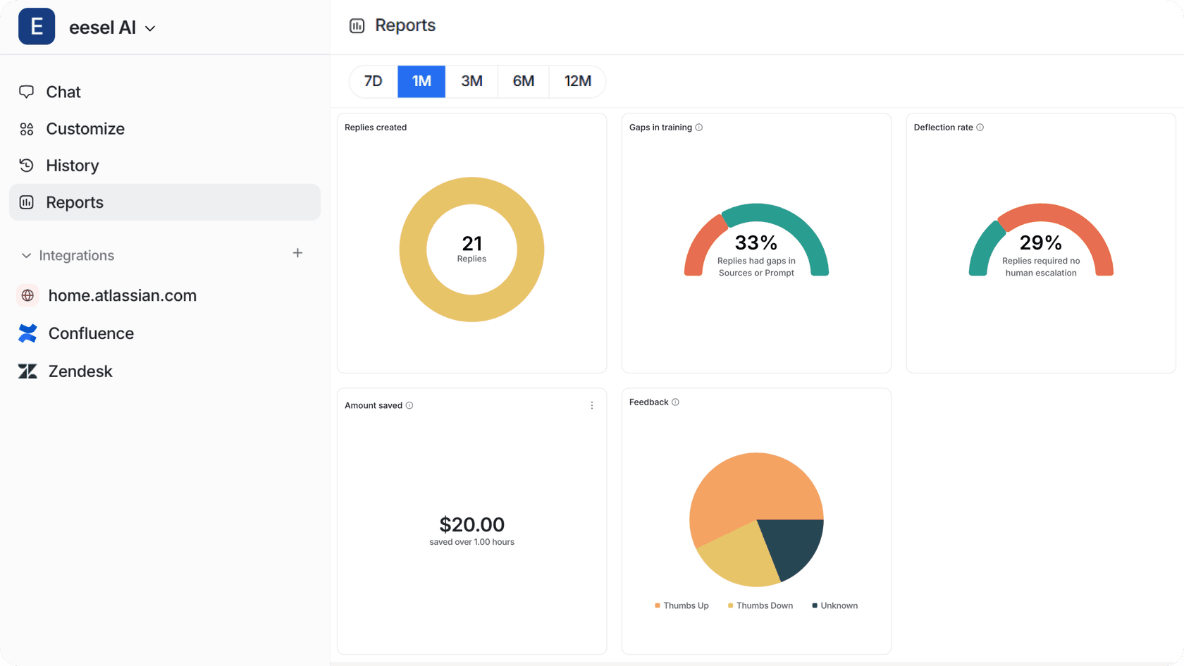 eesel AIのレポートダッシュボードを通じてAIのパフォーマンスを監視し、応答の正確性、解決率、コスト効率を追跡します。