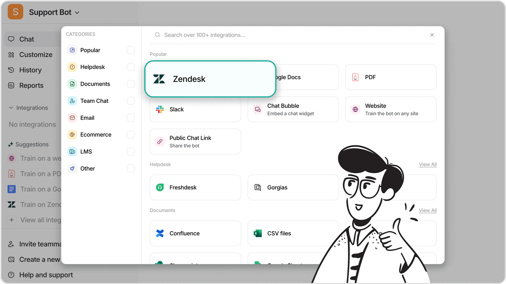 はい、Zendesk WebウィジェットはZendeskのネイティブAI機能と連携するほか、eesel AIのようなサードパーティ製ツールを統合することもできます。これらの統合により、返信の自動化、チケットのルーティング、即時回答の提供が可能になり、効率が向上します。